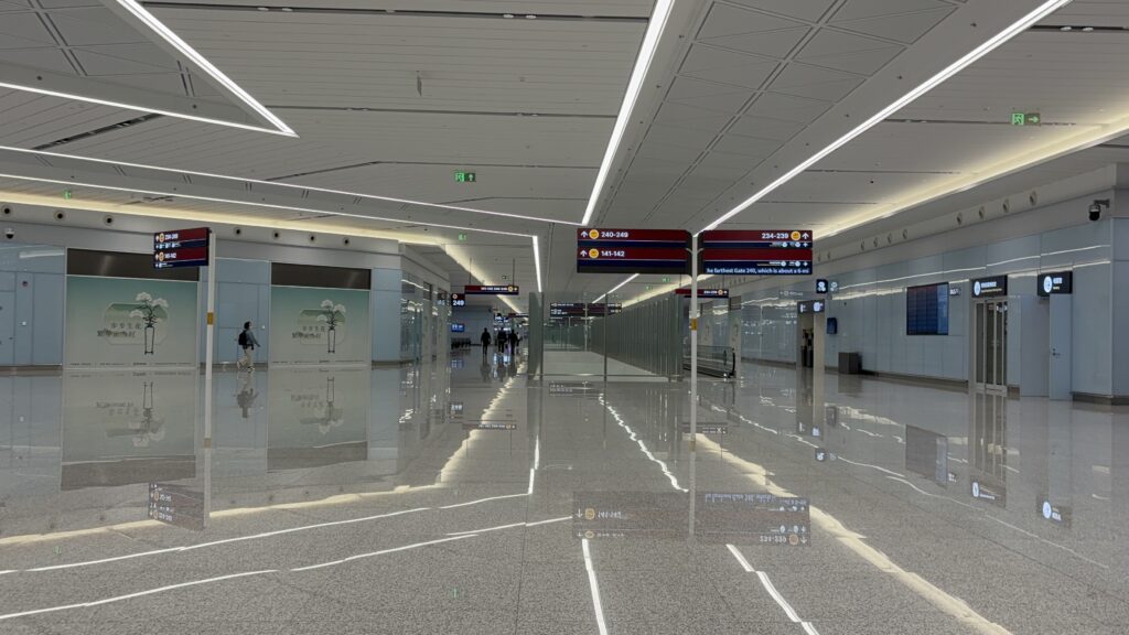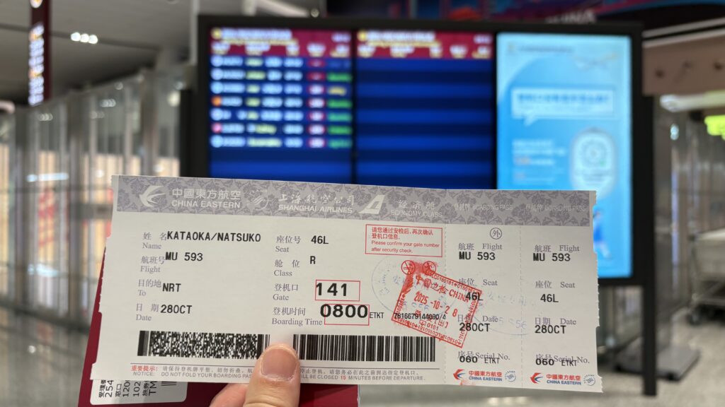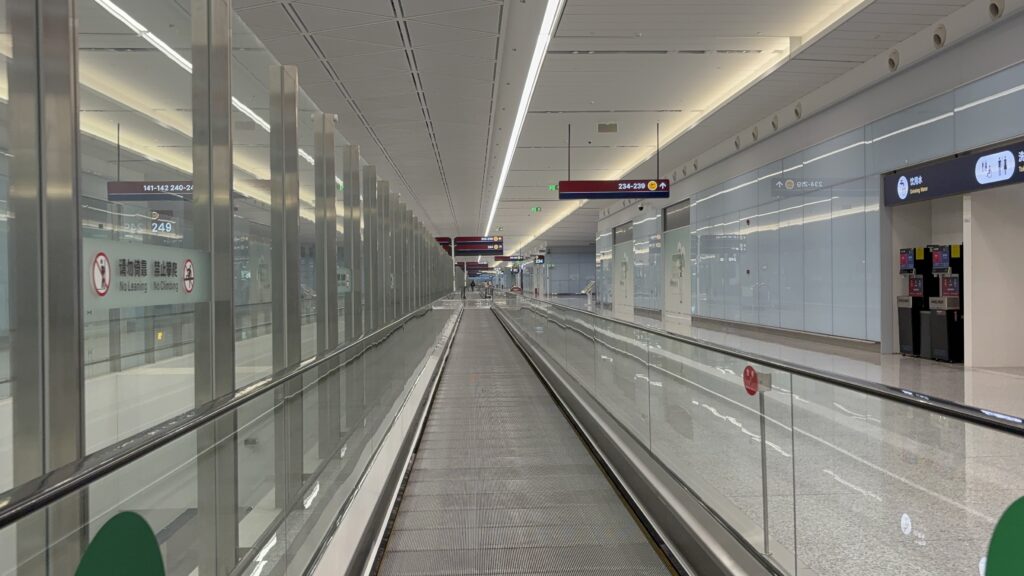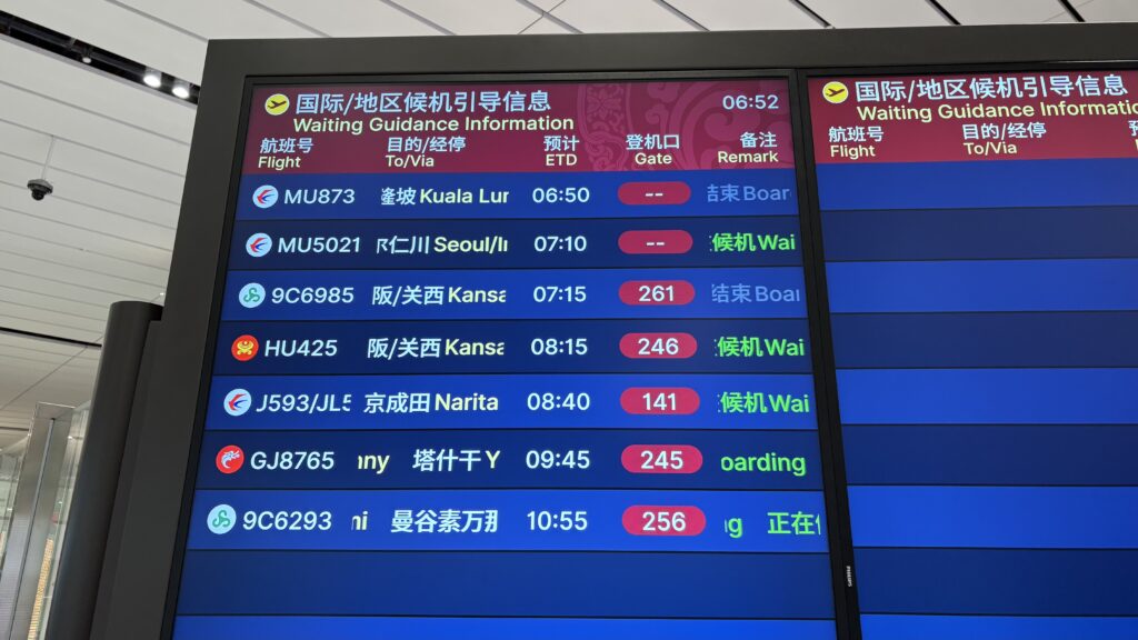 無事に、荷物を預け出国審査をして東方航空 MU593便 08:40発 搭乗ゲート141へ向かう。 これがまた歩く歩く💦