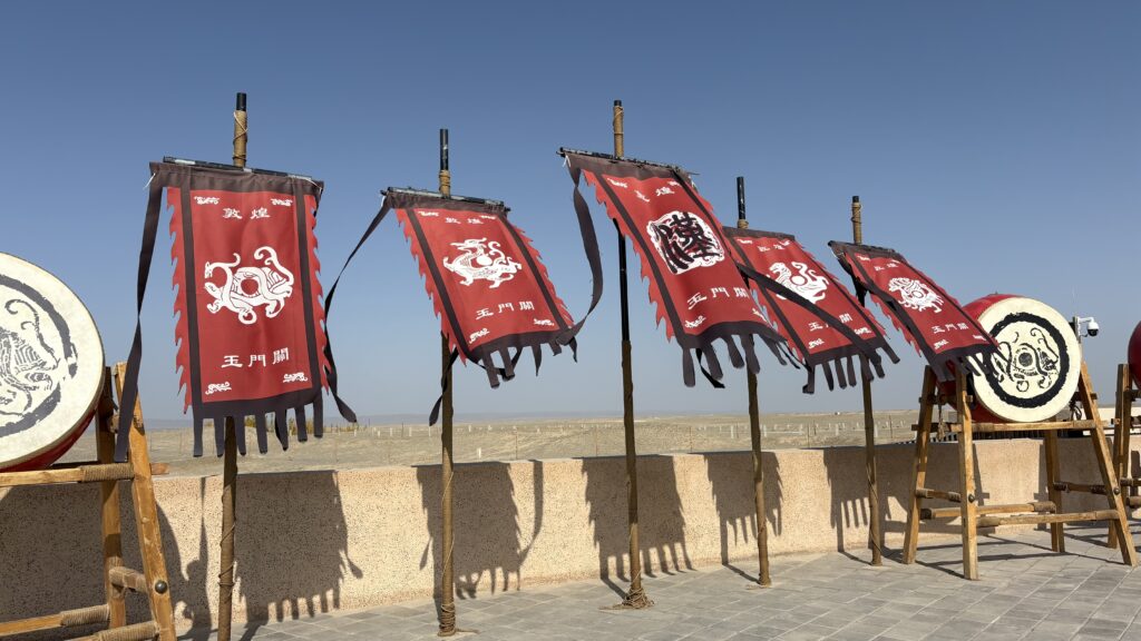 ↓↓「玉門関」は、陽関から見ると北の位置にあるからでしょうか、旗や太鼓には「北」の四神「玄武」の絵がありました。