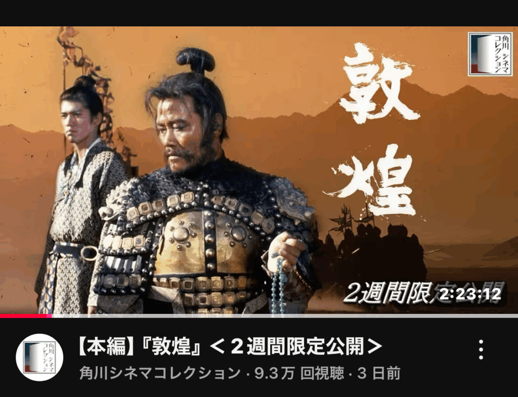 ↓↓YouTubeで西安敦煌関連を見漁っていたら突如として流れてきた映画「敦煌」の無料配信!2週間期間限定!!
