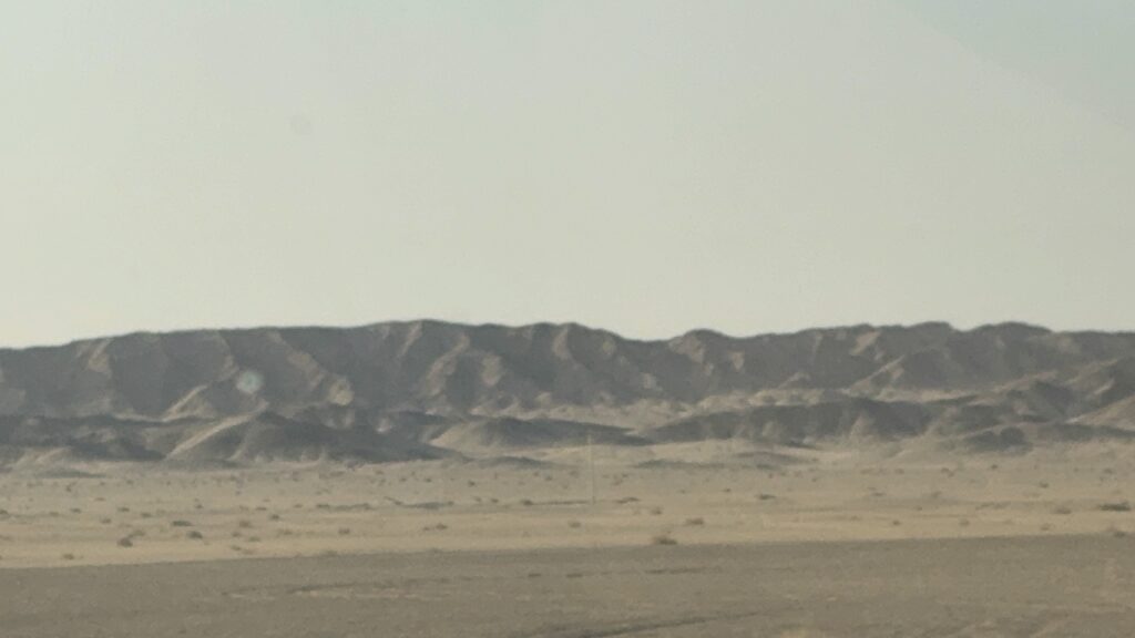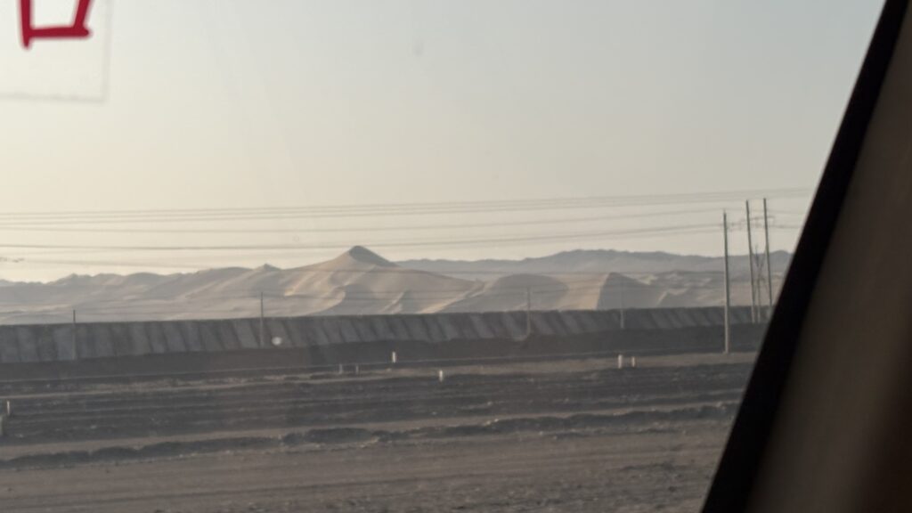 ↓↓車窓からは、右も左も遥か遠くに砂丘が見えます。