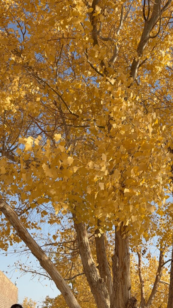 ここで、現地ガイドさん曰く目の前にある葉が黄色く染まったこの木は、「黄葉」とのこと。でもそれって、秋に黄色に変化する葉を持つ木々の総称では?と思ったり。葉の先端が分かれてギザギザに見えるよね、カエデの仲間かな~。。。一見、日本でよく見る「いちょう」の木かな?と思っていたらそうではなさそうだった。風に吹かれながら陽を浴びる葉はとっても美しく綺麗に色づいていました🍁