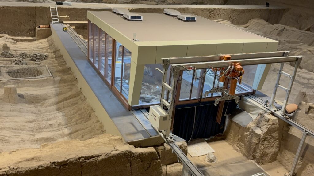 ↓↓この白い箱型の建物も以前はなく、2024年に導入された発掘装置。湿度や照明の強さをコントロールできるように調整する装置だそうです。