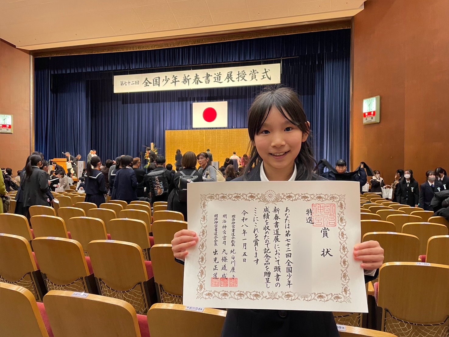 来年は、もっともっと立派な字を書けるように頑張りたいです。印象に残っている作品は「希望の光」と「希望の朝」でした。