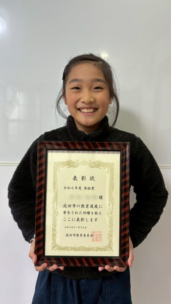 2025年二学期終業間近、学校で表彰を受けたとお母様と一緒に報告をしに来てくれたYさんでした。