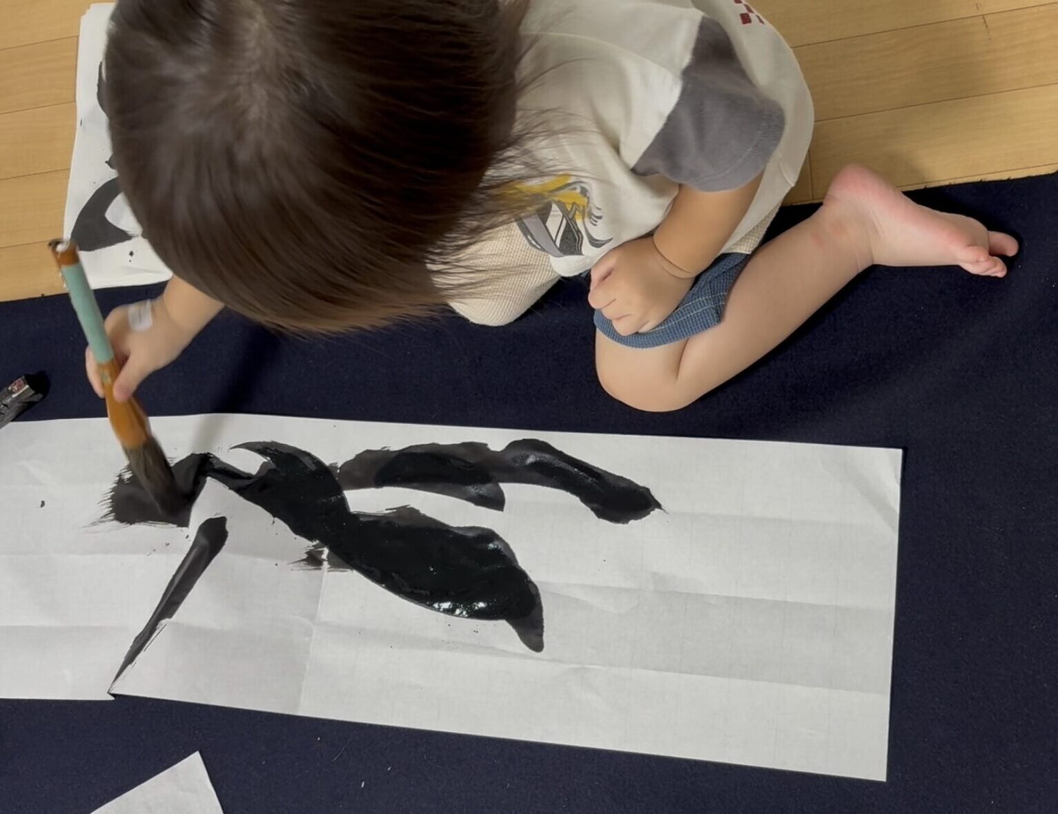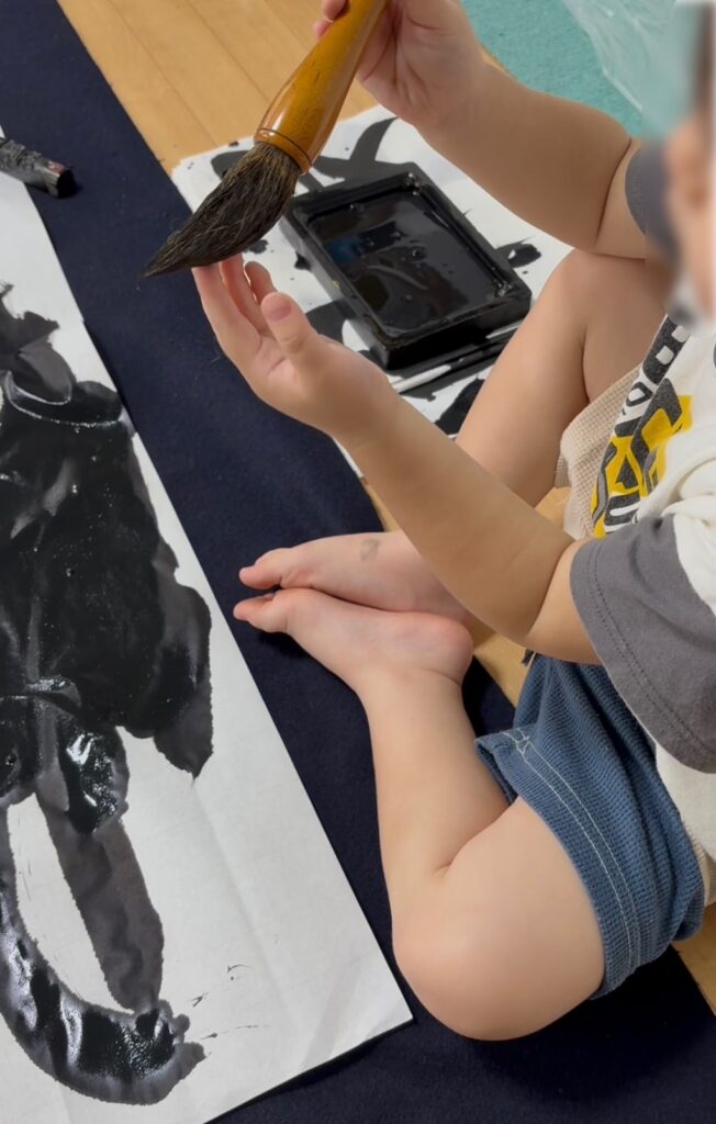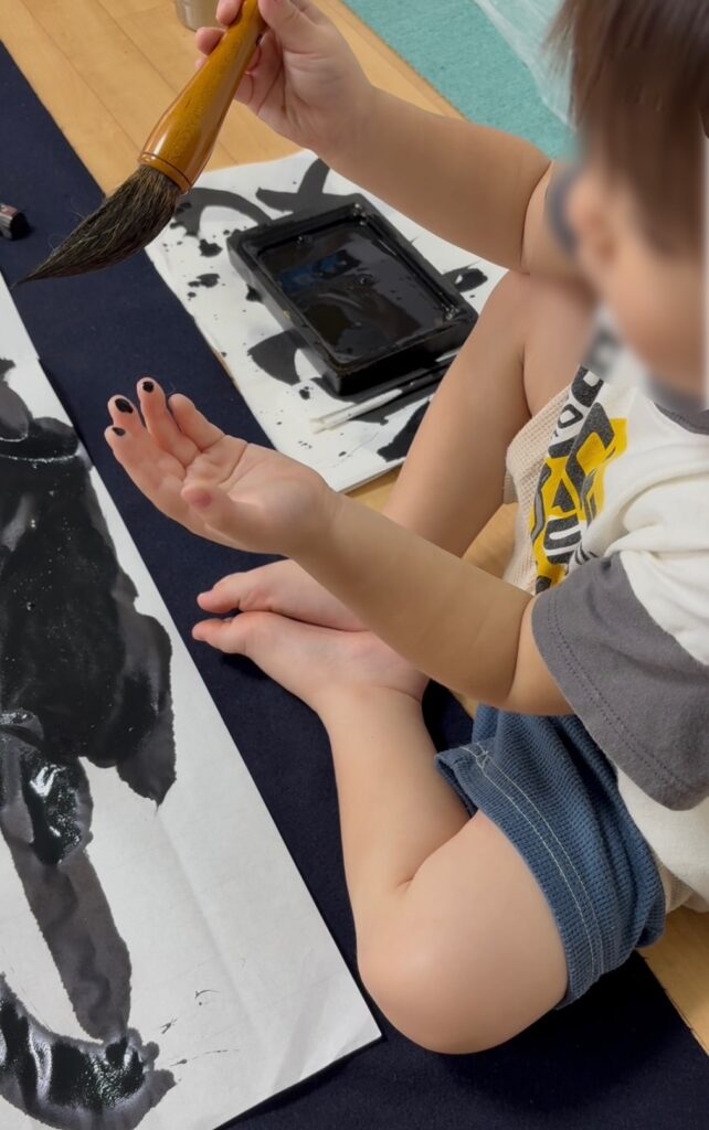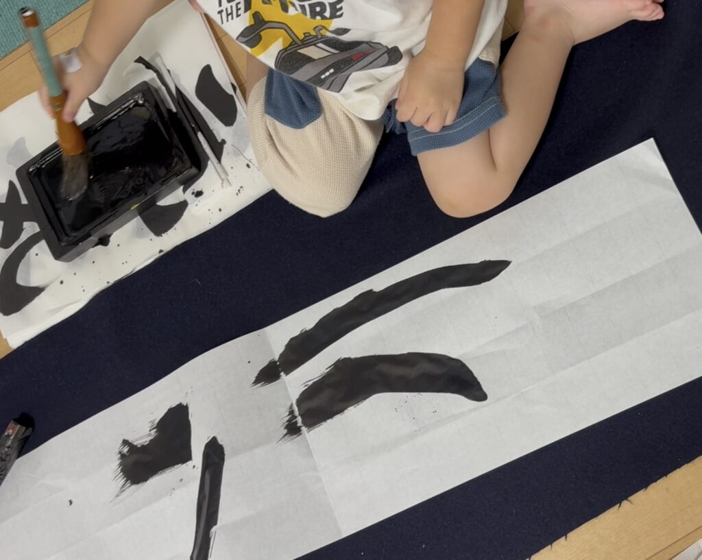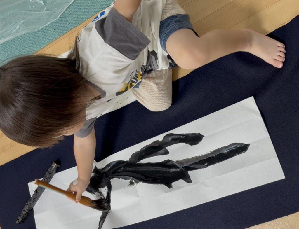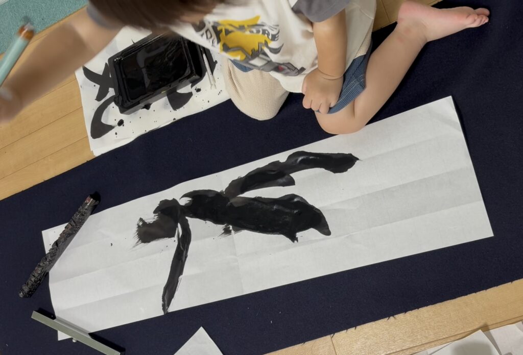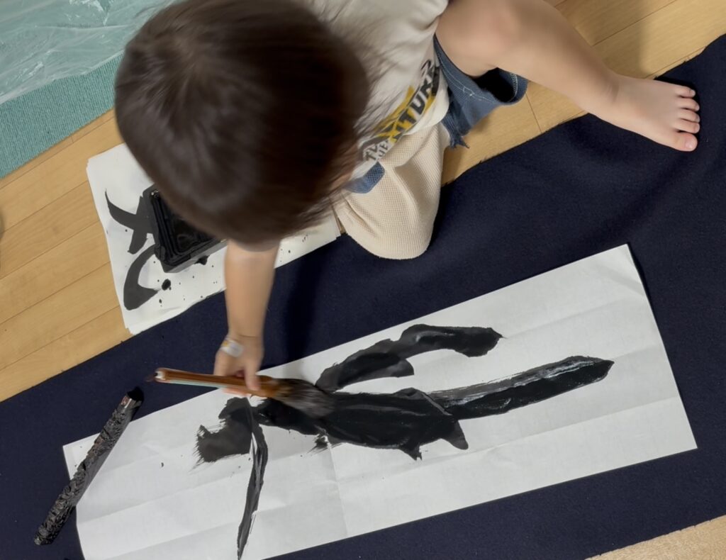 床一面に広げられた紙を上手く飛び越えて来る2歳8か月の孫は、物珍しさから毎度筆を持って書きたがります。