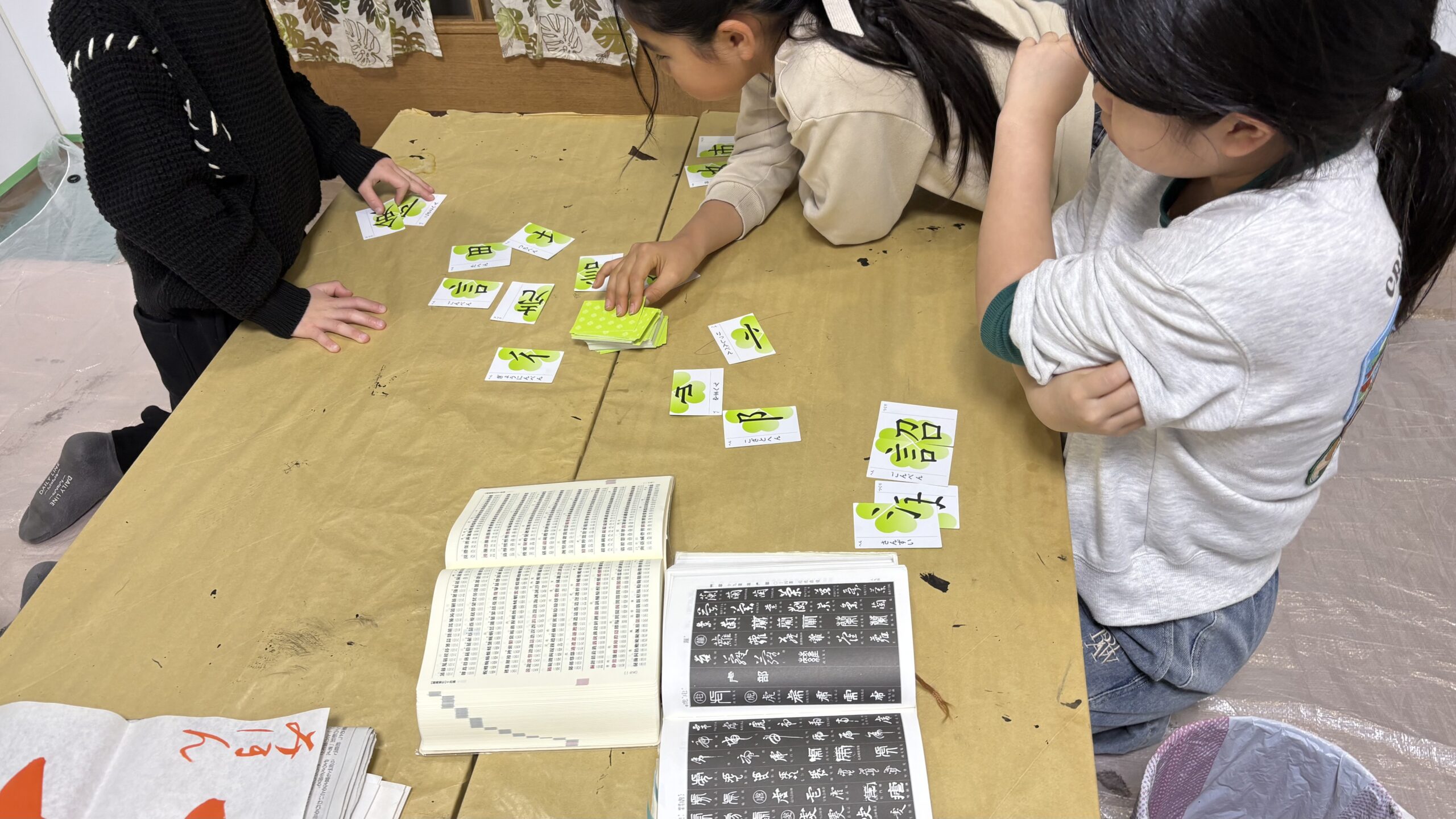 稽古内、子どもたちで10分と決めて「漢字はかせ」カードを使って文字を学び合う。